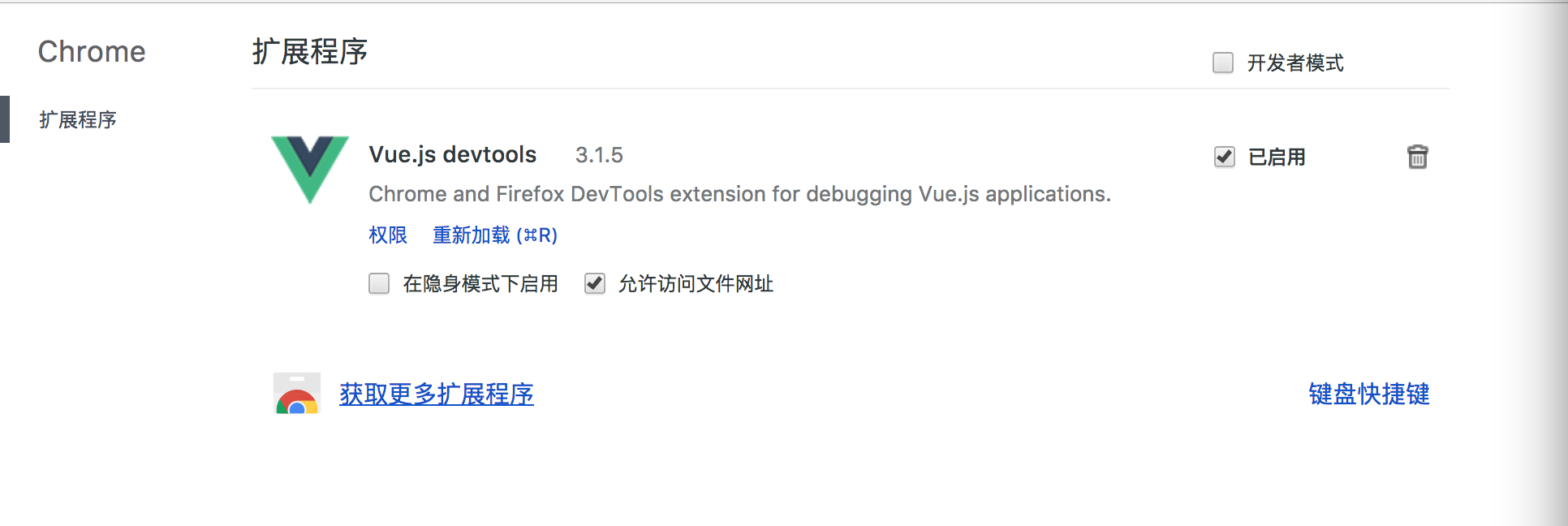 点击加载已解压程序按钮, 选择 vue-devtools > shells > chrome 放入, 安装成功如下图