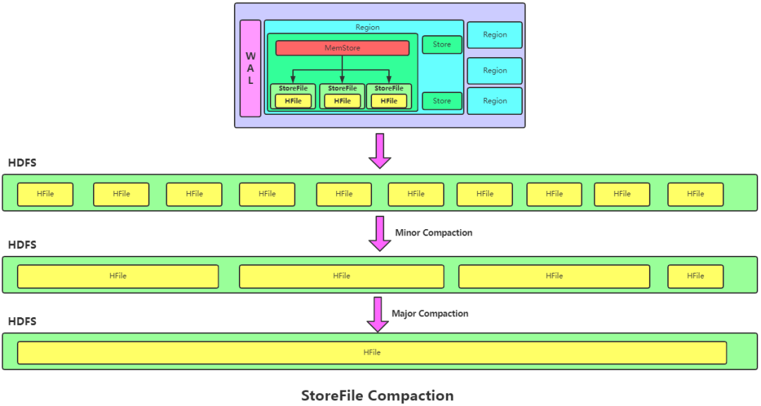 由于 MemStore 每次刷写都会生成一个新的 HFile,且同一个字段的不同版本(timestamp) 和不同类型(Put/Delete)有可能会分布在不同的 HFile 中,因此查询时需要遍历所有的 HFile。为了减少 HFile 的个数跟清理掉过期和删除的数据,会进行 StoreFile Compaction。