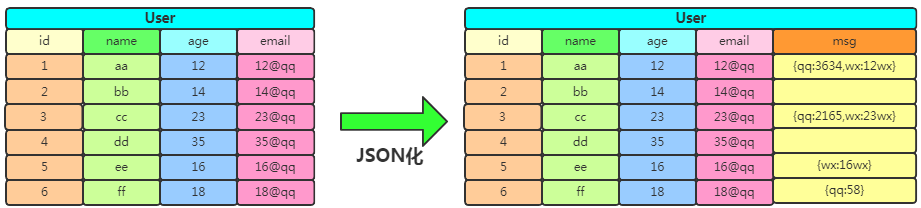 但是你要知道不是所有用户都要微信号的,微信号这一列是设置默认值还是采取其他的做法就得权衡一下了。如果需扩展很多列出来,但不是所有的用户都有这些属性,那么拓展起来就更加复杂了。这时可以用下JSON格式的字符串,将若干可选择填写信息汇总,而且属性字段可以动态拓展,于是有了下边做法:至此你可能认为这样存储数据它不挺好的嘛,用 HBase 出来干嘛?Mysql 有个致命缺点,就是当数据达到一定的阈值,无论怎么优化,它都无法达到高性能的发挥。而大数据领域的数据,动辄 PB 级数据量,这种存储应用明显是不能很好的满足需求的!并且针对上边的问题,HBase 都有很好的解决方案~~。