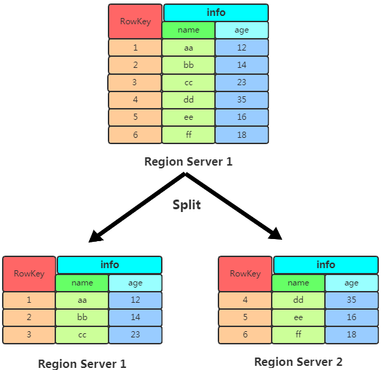 每个 Table 起初只有一个 Region,随着不断写数据 Region 会自动进行拆分。刚拆分时,两个子 Region 都位于当前的 Region Server,但出于负载均衡的考虑, HMaster 有可能会将某个 Region 转移给其他的 Region Server。
