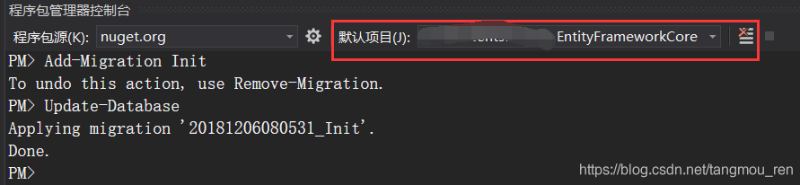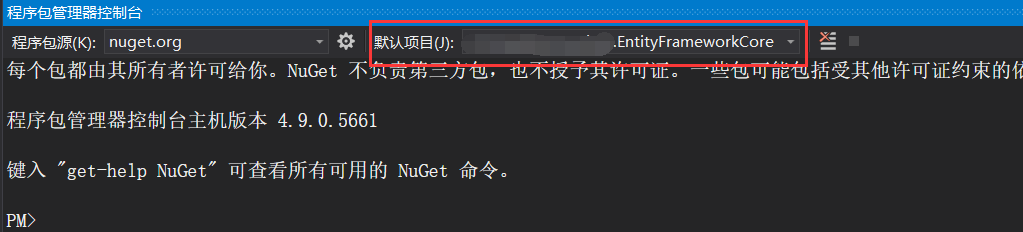 打开程序包管理器控制台,并选中.EntityFrameworkCore