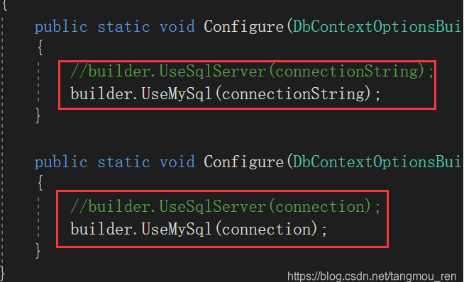 在解决方案的EntityFrameCore层找到DbContextConfigurer文件,并做如下修改: