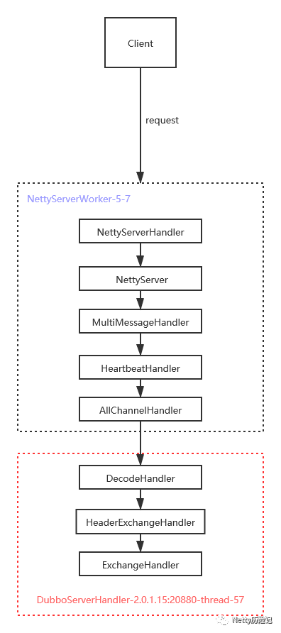 首先会由NettyServerHandler处理请求,然后依次将请求传递下去,最后到ExchangeHandler.