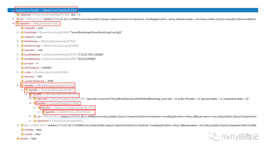 从DubboProtocol类的requestHandler属性到NettyServer的nettyServerHandler属性.