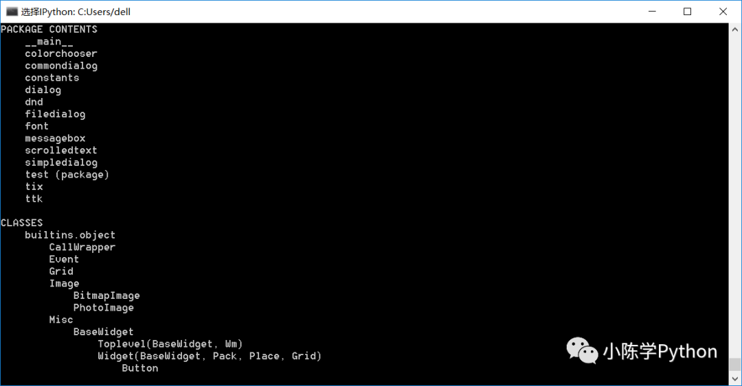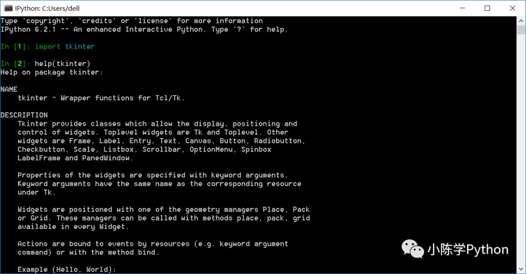 首先来大概看一下tkinter的描述,依旧是先导入然后使用使用help查看,如图所示。