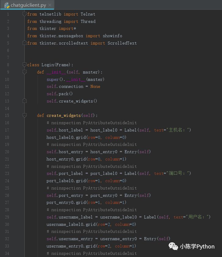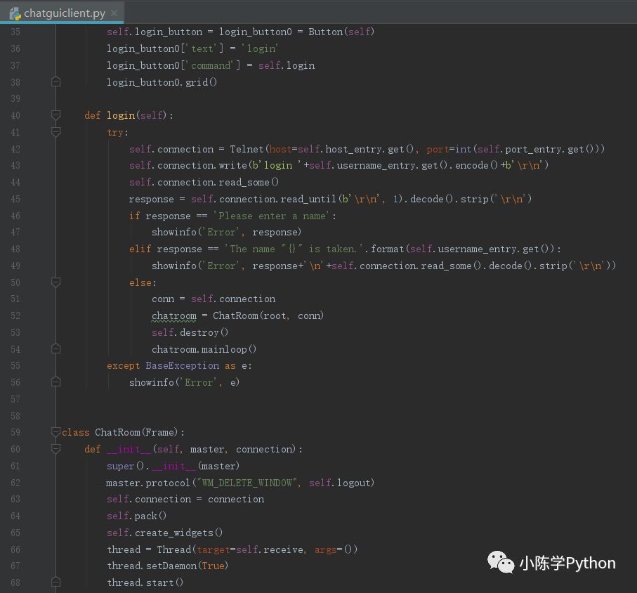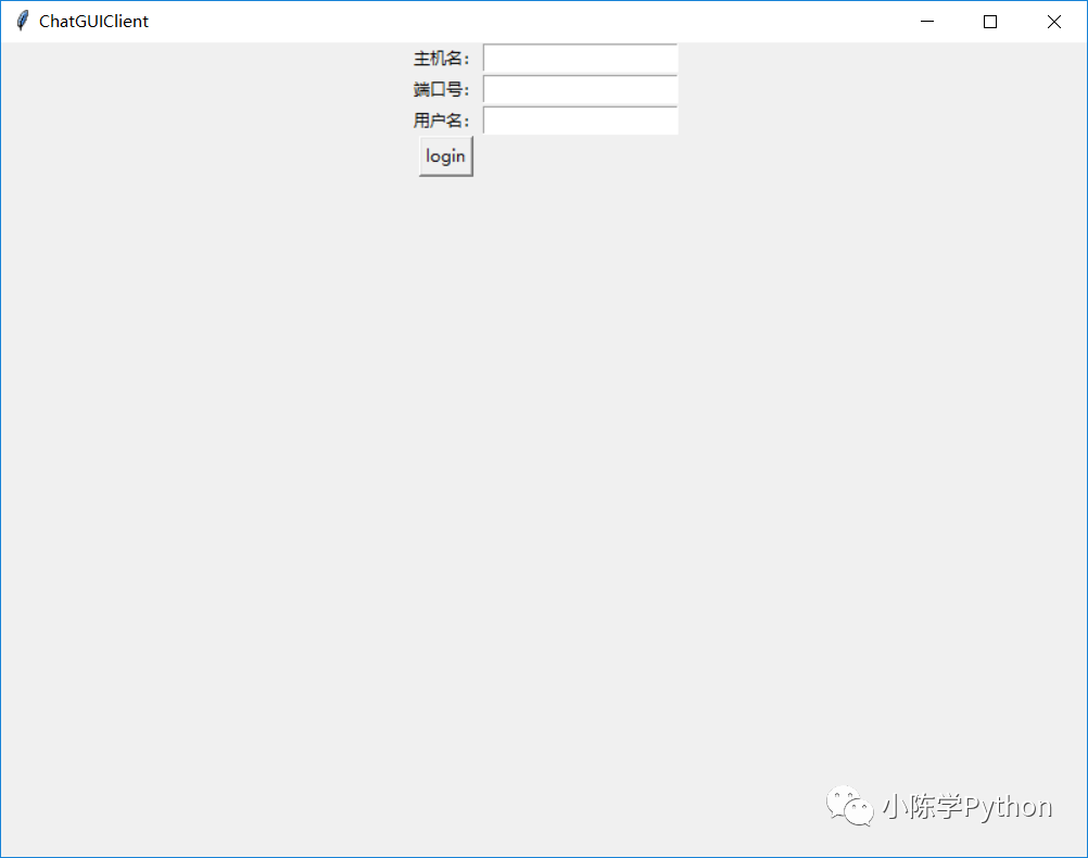下面我直接通过编写GUI客户端来向大家介绍一些tkinter中常用的控件,在编写之前,我们首先想一下连接服务器并登录聊天室的过程。连接服务器,我们需要提供主机名和端口号,登录时我们需要提供用户名。既然如此,我们可以定义三个单行文本框(Entry类的实例),这样还不够,仅仅三个单行文本框,一点提示都没有,鬼知道哪个是输入主机名,哪个是输入端口号,哪个是输入用户名,所以我们应该在单行文本框的左边放上一些提示信息(Label类的实例)。这样还不够,因为登陆进去还是需要触发一个事件,这个事件我们可以绑定在一个按钮上,当点击按钮时就触发该事件。下面我给出如何编写该事件的具体过程。
