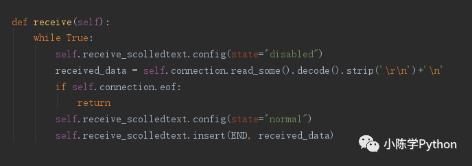 既然发送数据相关的一系列事件已经处理好了,接收数据又该通过何种方式来实现呢?因为发送数据是用户自己点击按钮来实现的,接收数据是一有数据就要立刻接收,因此我们把接收数据丢给一个单独的线程来处理就可以了,具体怎么接收数据,我们只需要一个无限死循环即可,只要不是关闭连接,它就会一直等数据。代码实现起来也是很简单,如图所示。