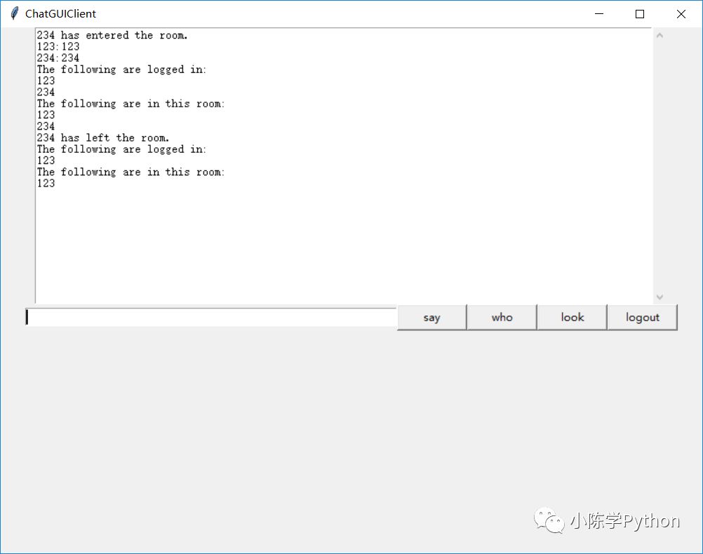 这个也不难,我们需要一个控件用来设置发送的数据,这个控件就是一个单行文本框。接下来就是用来处理接受的数据的一个控件,这个控件是一个滚动文本框,把接收到的数据就显示在其中,然后就是分别用来处理发送数据、查看聊天室都有谁、查看谁已登录、退出的按钮。按钮中同样要绑定相应的事件,这四个事件的编写一点也不难,每当点击一个按钮(退出按钮除外),我们就发送相应的命令到服务器执行,然后清空用来发送数据的单行文本框的内容,如图所示。