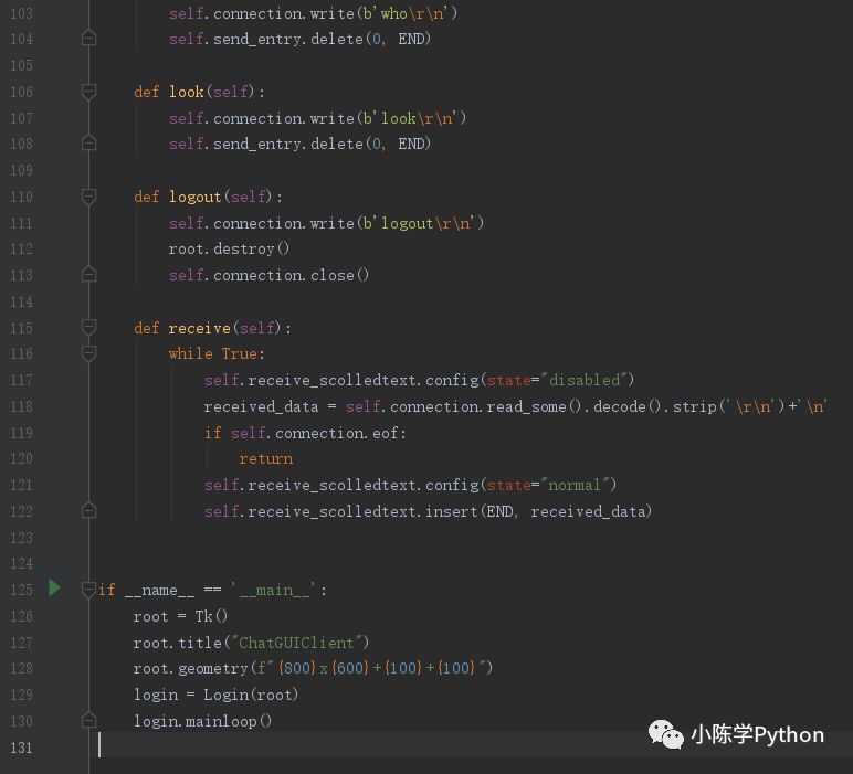 在给出完整代码之前,我首先来说两个比较重要的细节,1.这个用来接收数据的线程必须是守护线程,因为主线程结束,它也不能存在,如果不是守护线程,这样的话连接资源可能就一直被该线程占用;2.点击退出按钮的事件到最后会把连接资源关闭,可是有些用户并不是通过这种方式退出,然后点击右上角的×来关闭,因为在点击×之后,没有发送logout命令到服务器,服务器并不会删除这个连接,为了确保在这种情况下,连接资源也被释放,我们可以做一个回调,在点击右上角的×时也会调用退出按钮的事件即可。