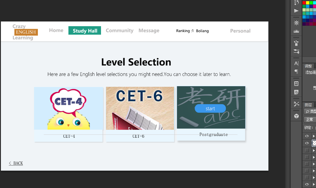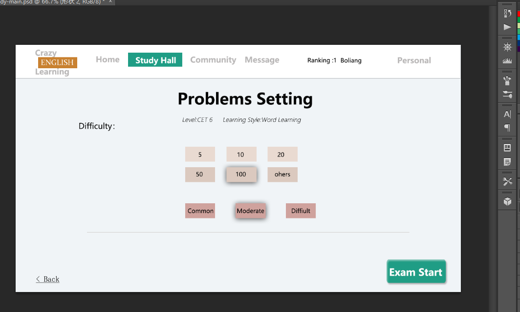 然后就是主模块,即学习模块,学习模块首先划分学习层次,有英语四级学习,英语六级学习,考研英语学习三大学习层次, 选择好学习层次后, 就可以选择分类学习, 组合学习和整体学习, 分类学习有单词学习,短语学习, 句子翻译学习(四六级汉译英,研考英译汉), 完型填空学习, 阅读理解学习, 还有写作练习;组合学习是从分类中用户选择要组合的类型进行套卷组合进行学习, 而整体学习是包括了所有分类题型的学习。分类学习可以选择题目数量,最少5道题以上,最多100道题,增加数目以5的倍数增加。