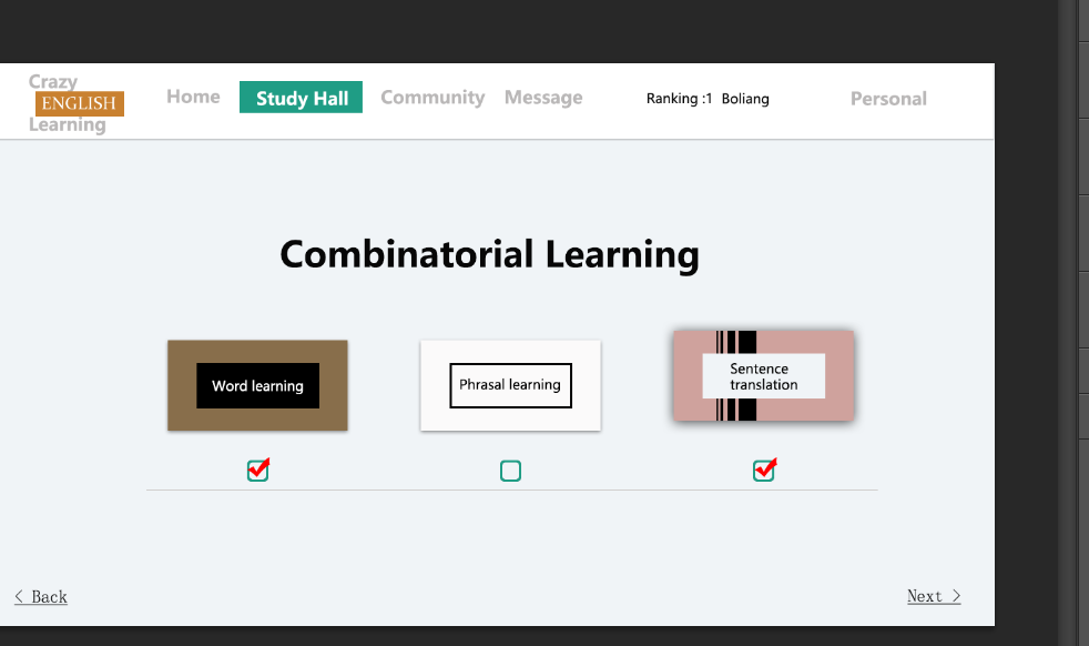 选择分类学习/组合学习/整体学习, 其中分类学习可以选择单词学习,短语学习,句子翻译学习,完型填空学习,阅读理解学习和写作学习等。组合学习可以任意选择一个或多个分类学习中的类型进行套卷组合来做题。整体学习结合所有分类来整体出卷。组合学习和整体学习还可以选择不同的类型的题目的出题数量来进行学习
