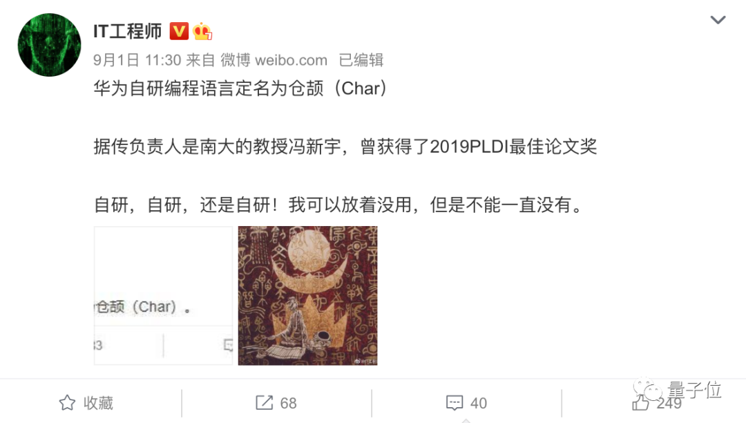 据微博博主@IT工程师 称,华为正在研发新的自主编程语言仓颉,领头人是南京大学的计算机科学与技术系博士生导师,冯新宇。