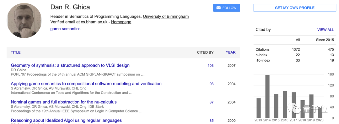 从谷歌学术来看,Dan R. Ghica的主要研究方向就是编程语言,h-index达22,论文一共被引用一千余次。