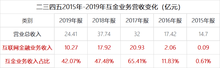 陈于冰用数字证明了自己在互金领域的掘金能力。2015年-2019年,二三四五互金业务收入从第一年的900万元出发,先后实现了2.06亿元、20.93亿元、17.92亿元、10.27亿元;2016年-2019年,互金业务收入分别占当年营收比重为11.83%、65.41%、47.48%、42.07%,从零出发到占公司营收半壁江山,也只用了二年而已。