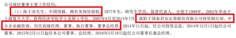 “关键先生”陈于冰正是在2014年11月加入了二三四五,并担任投资总监。二三四五披露的陈于冰简历显示,陈于冰先生现年42岁,中国国籍,拥有美国居留权。分别于1999年、2002年毕业于上海复旦大学,获得经济学院学士及硕士学位。2002年8月至2014年7月,就职于国泰君安证券股份有限公司投资银行部、中小企业融资部,历任高级经理、董事、执行董事、董事总经理。
