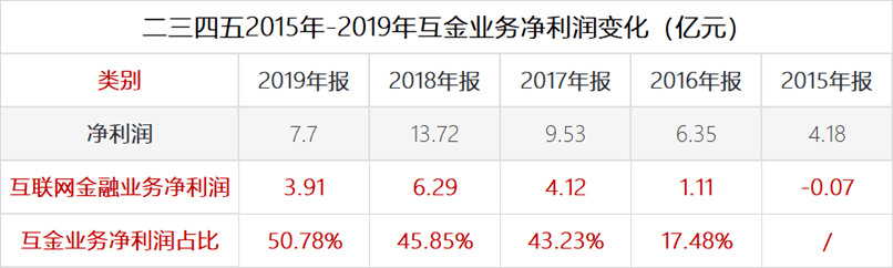 2017年,二三四五互联网金融业务贡献营收高达20.93亿元,首次超越其传统的广告营销和软件业务。不过,2018年,现金贷营收即开始收缩,到2019年,互金业务的营收便降低至2017年的一半。