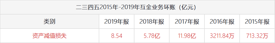 2015年-2019年,二三四五因现金贷业务出现的资产减值损失分别为713万元、3212万元、11.98亿元,5.78亿元和8.54亿元。其中,2017年-2019年的资产减值损失均超过了当年净利润。