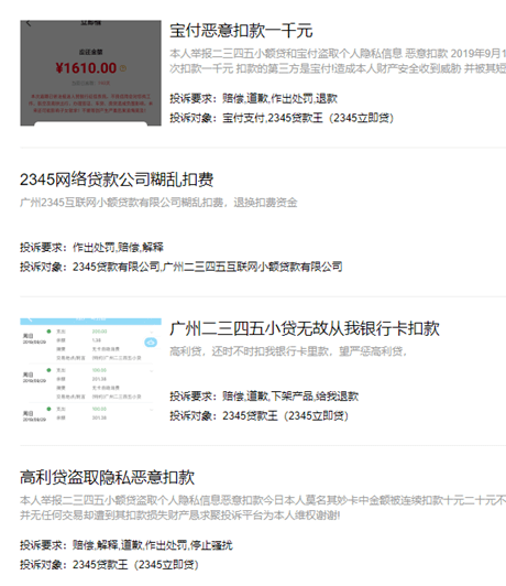 除此之外,借款人对2345贷款王的投诉还包括,联合支付公司恶意从借款人银行卡扣款,威胁爆通讯录,恶意催收等乱象。