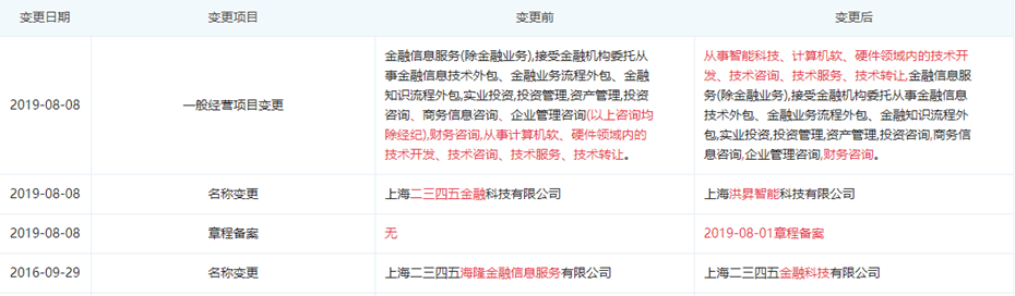 2016年9月,海隆金服改名为上海二三四五金融科技有限公司;2019年8月,再次改名为上海洪昇智能科技有限公司。