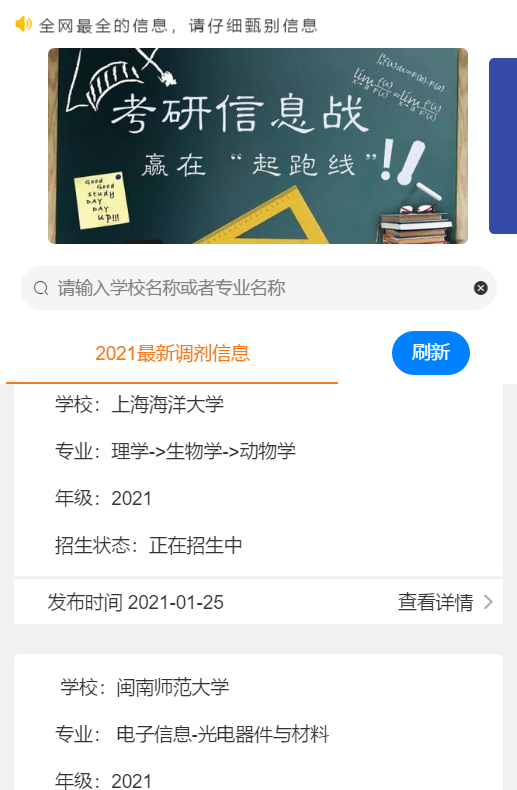 这是一个考研调剂信息搜索和展示的小程序,面对茫茫的调剂信息,方便考研学子搜索找到自己需要的考研调剂信息。