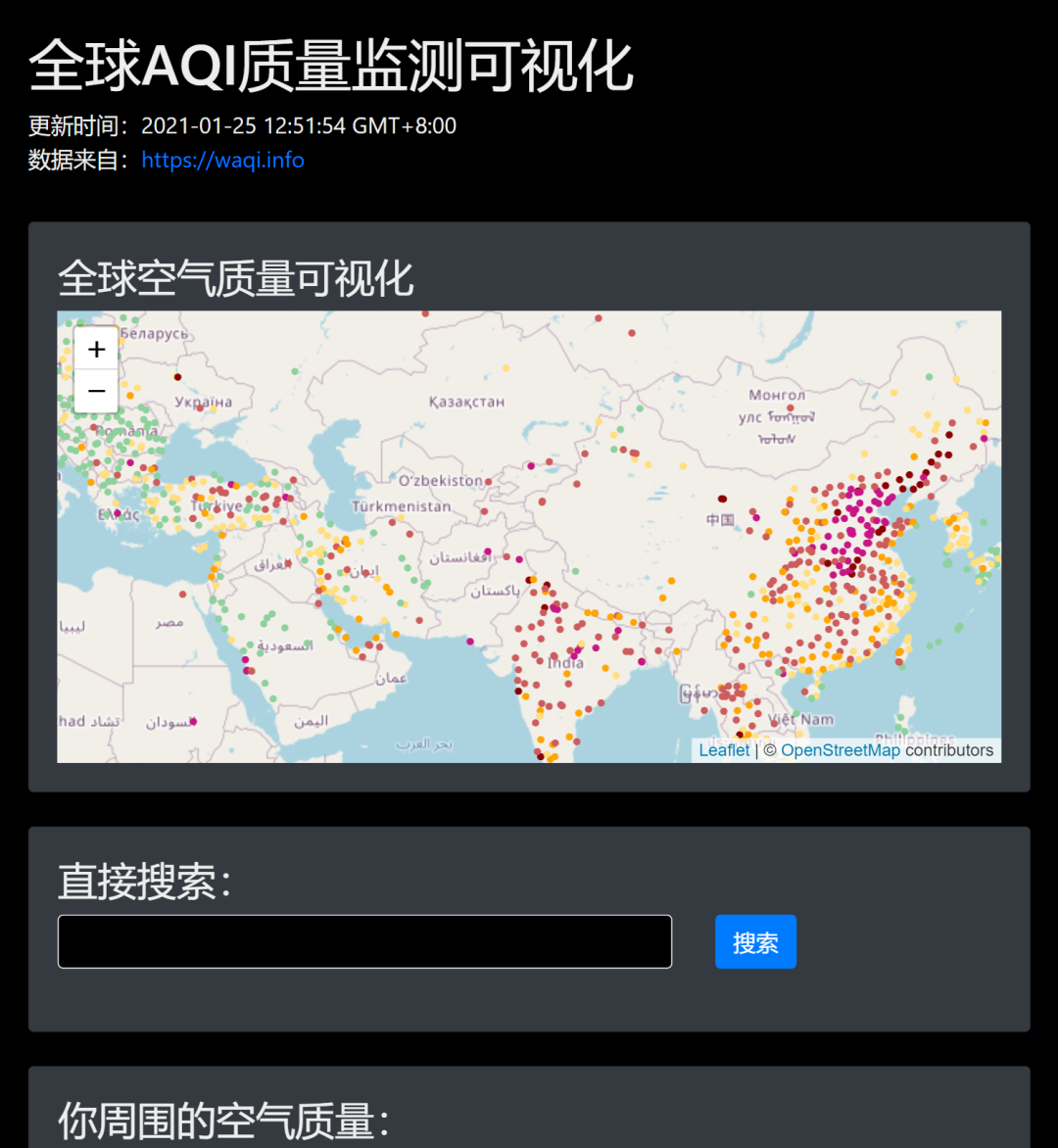 这是基于 CloudBase Framework + Express + Leaflet 搭建的 Web应用,可清晰直观的看到全球空气质量可视化的 2D 视图及其他信息。