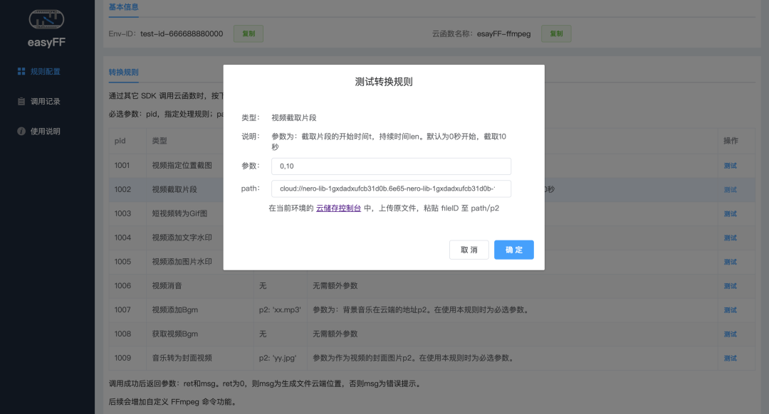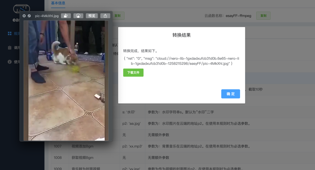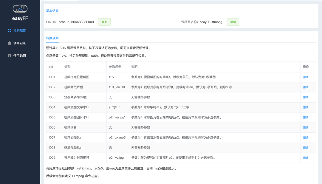 easyFF 是基于 FFmpeg 的简单短视频处理服务 + 后台管理 工具。部署即实现云函数接口,无需配置直接使用,后台可测试,查看调用记录等。