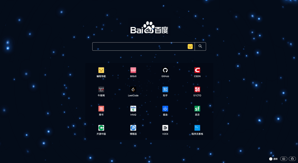 极简炫酷的浏览器主页!支持一键使用多个搜索引擎,主页内置了一些程序员必备优质站点,提升效率,还可以切换主题、定制壁纸等。