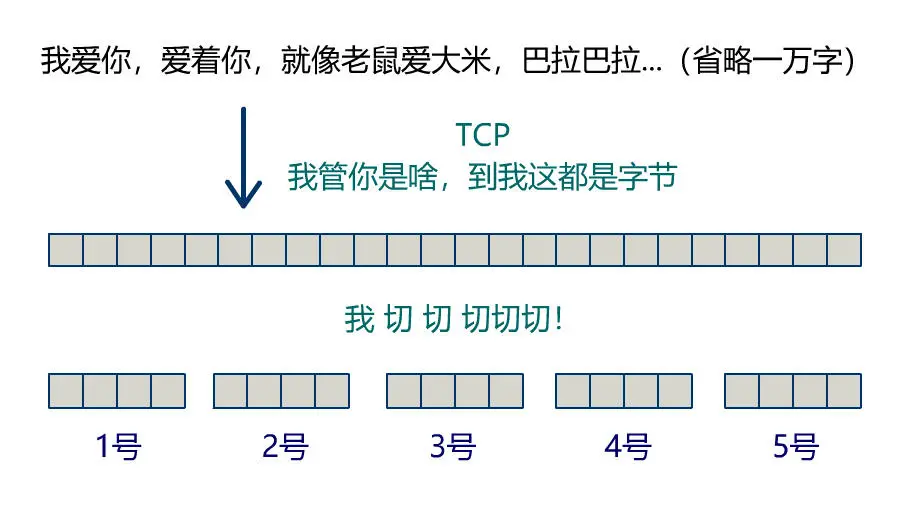 切割的时候我才不管你原来的数据表示什么意思,需要在哪里断句啥的,我就把它当成一串毫无意义的字节,在我想要切割的地方咔嚓就来一刀,标上序号,只要接收方再根据这个序号拼成最终想要的完整数据就行了。
