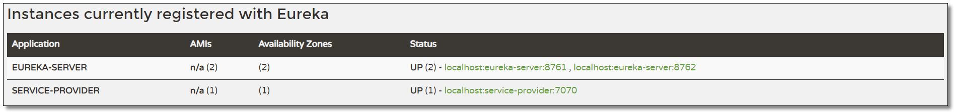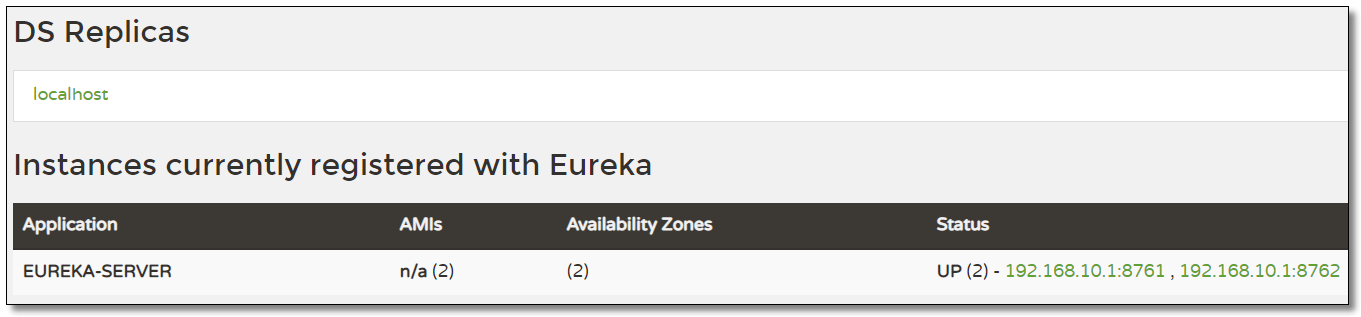 访问:http://localhost:8761/ 或者 http://localhost:8762/ 都出现如下图说明互相注册成功。