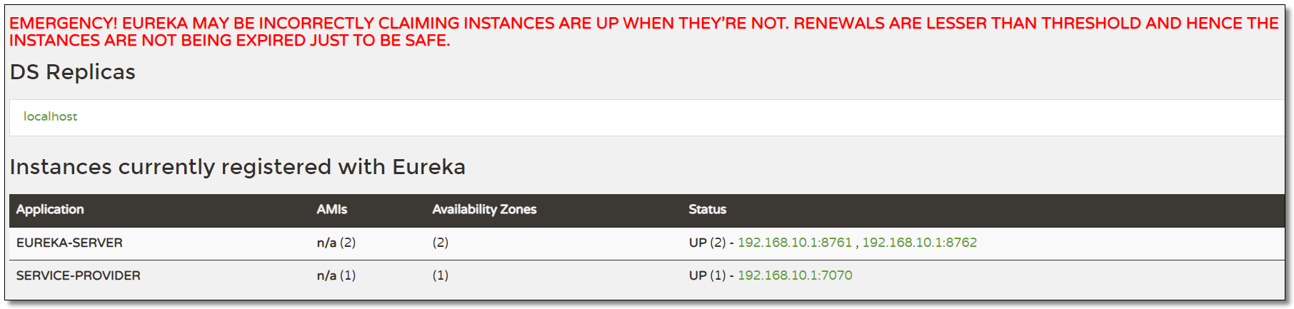 Eureka Server 在运行期间会去统计心跳失败比例在 15 分钟之内是否低于 85%,如果低于 85%,Eureka Server 会将这些实例保护起来,让这些实例不会过期,同时提示一个警告。这种算法叫做 Eureka Server 的自我保护模式。