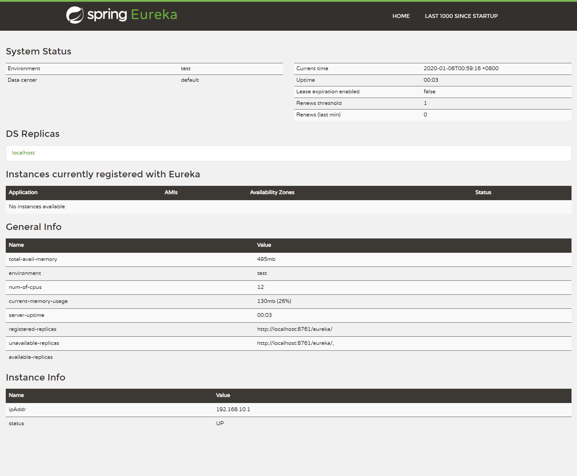 此时如果直接启动项目是会报错的,错误信息:com.sun.jersey.api.client.ClientHandlerException: java.net.ConnectException: Connection refused: connect,这是因为 Eureka 默认开启了将自己注册至注册中心和从注册中心获取服务注册信息的配置,如果该应用的角色是注册中心并是单节点的话,要关闭这两个配置项。