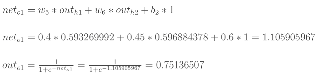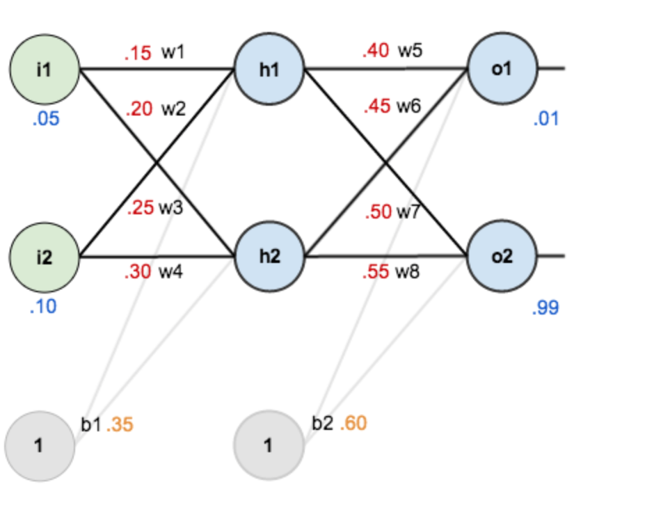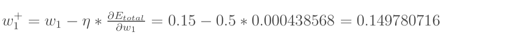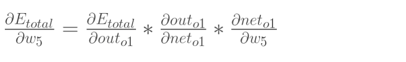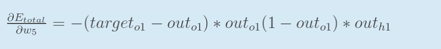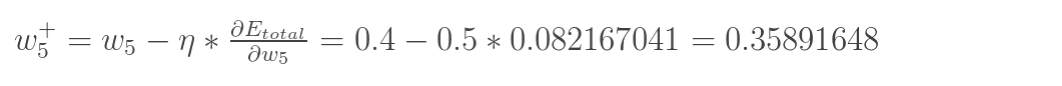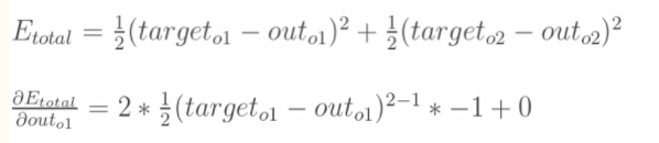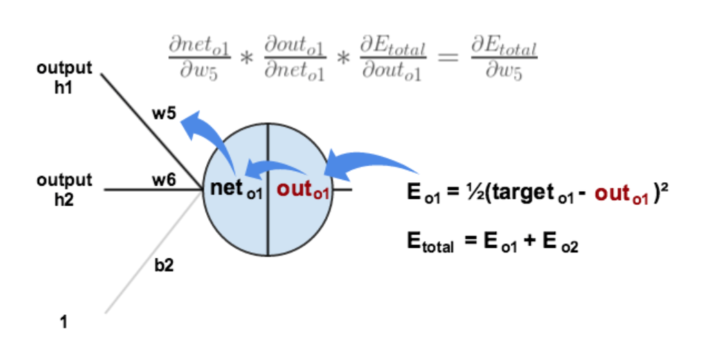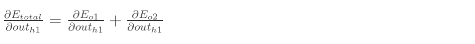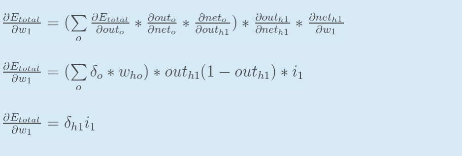 方法其实与上面说的差不多,但是有个地方需要变一下,在上文计算总误差对w5的偏导时,是从out(o1)---->net(o1)---->w5,但是在隐含层之间的权值更新时,是out(h1)---->net(h1)---->w1,而out(h1)会接受E(o1)和E(o2)两个地方传来的误差,所以这个地方两个都要计算。