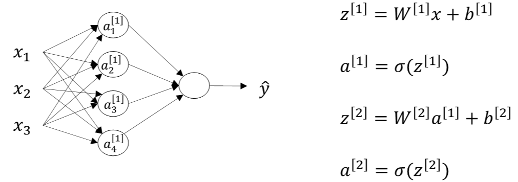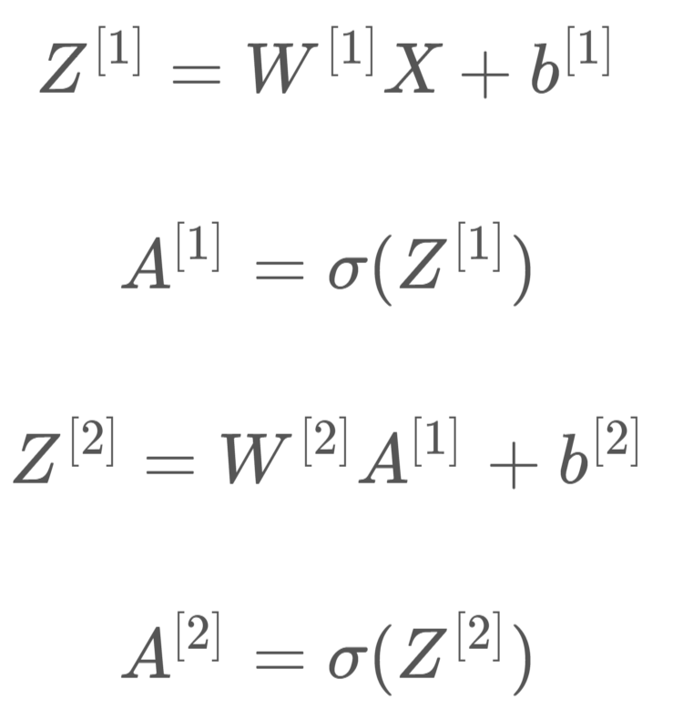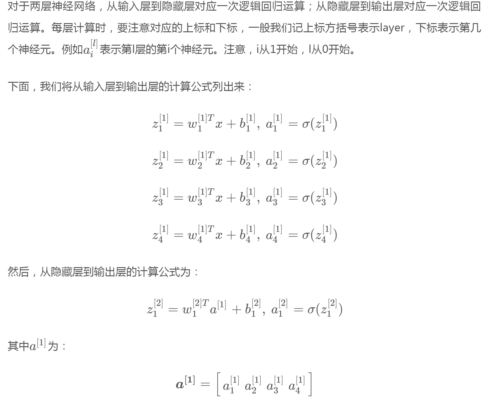 其中,Z[1]的维度是(4,m),4是隐藏层神经元的个数;A[1]的维度与Z[1]相同;Z[2]和A[2]的维度均为(1,m)。行表示神经元个数,列表示样本数目m。