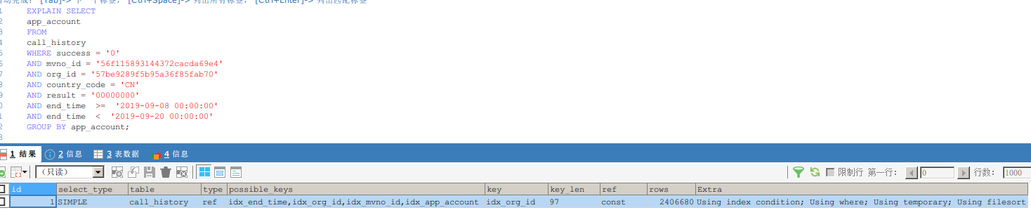 至此问题解决,其实同事昨天也在怀疑,是不是这个表索引建的太多了,导致用的不对,原本用的是idx_org_id和idx_mvno_id。