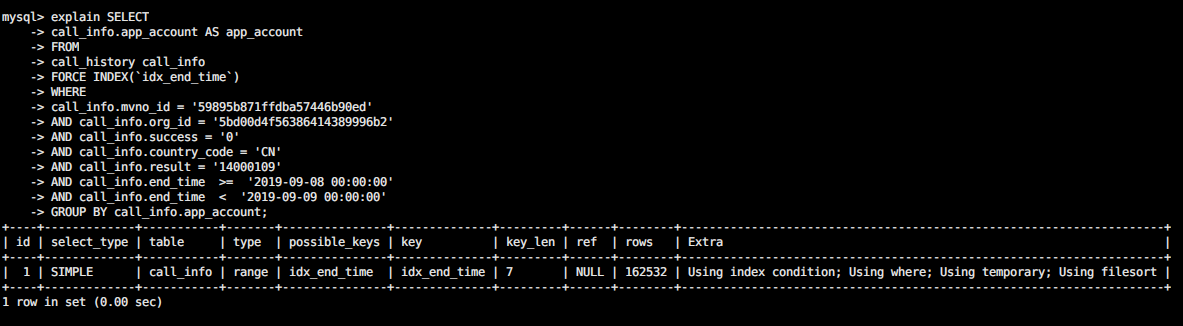 然后果断在现网试了下,强制指定使用idx_end_time索引,结果只要0.19秒!