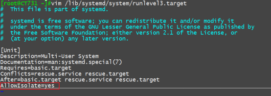 在centOS6上,我们切换级别使用init,在centOS7上虽然也能使用,但是已经不再是原来的程序了,现在我们使用systemctlisolate name.target来切换target。比如,我们想切换到字符界面,我们就可以使用systemctlisolate multi-user.target来进行切换。要想切换运行级别,在/lib/systemd/system/*.target文件中AllowIsolate=yes才可以。(修改文件需执行systemctldaemon-reload才能生效)