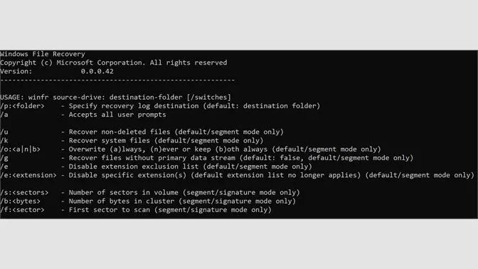 安装完成之后,我们再来说说Windows File Recovery的具体用法,Windows File Recovery支持三种恢复模式,分别是:默认模式、分段(segment mode)、签名(signature mode)。