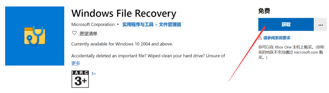 首先,通过下载链接打开“Windows File Recovery”的下载界面,点击“获取”按钮安装。(下载地址:https://www.microsoft.com/zh-cn/p/windows-file-recovery/9n26s50ln705?activetab=pivot:overviewtab)