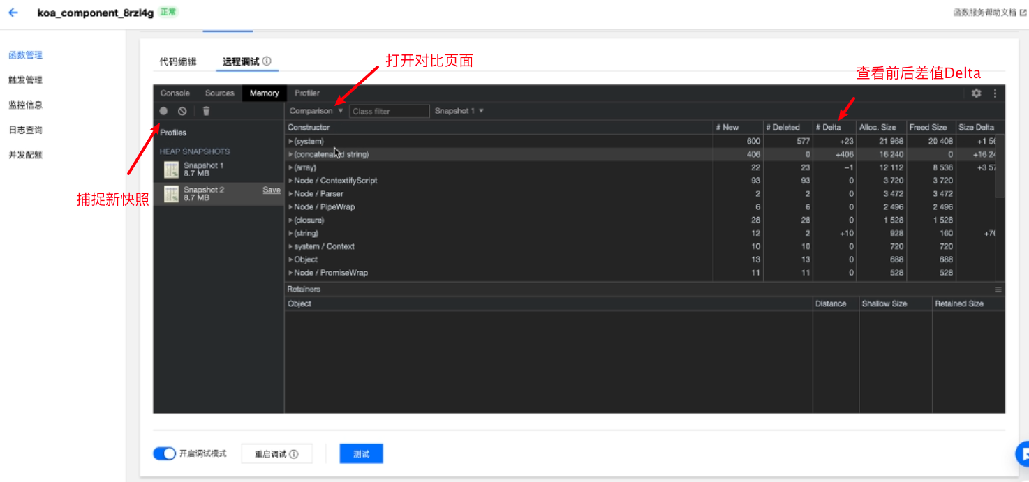 本篇文章将以一段内存泄漏的代码为例,给大家展示如何使用云函数在线调试功能定位和解决问题。Node10 及以上版本的 runtime,使用 Chrome 浏览器打开云函数控制台,在函数代码页即可看到在线调试的入口。