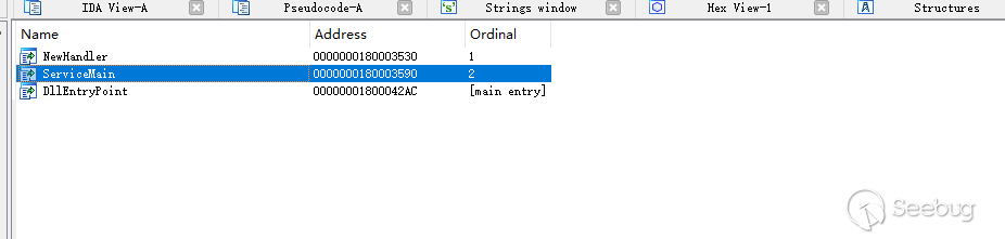 其拥有如下导出函数ServiceMain,调用并且注册服务