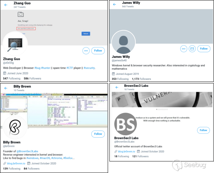 攻击者为了与安全研究者建立互信并保持联系,首先会在一些社交媒体上发布一些漏洞研究博客和Twitter,吸引相关研究者的关注。其已知的攻击策略有两种: