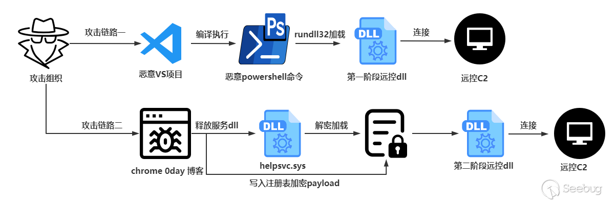 根据Google安全报告以及安全人员反馈,该攻击者还疑似使用chrome浏览器0day漏洞对目标进行攻击。攻击成功会在其相关注册表留下被加密的payload,并且释放一个伪造为驱动文件的DLL文件创建服务进行驻留(如helpsvc.sys)。