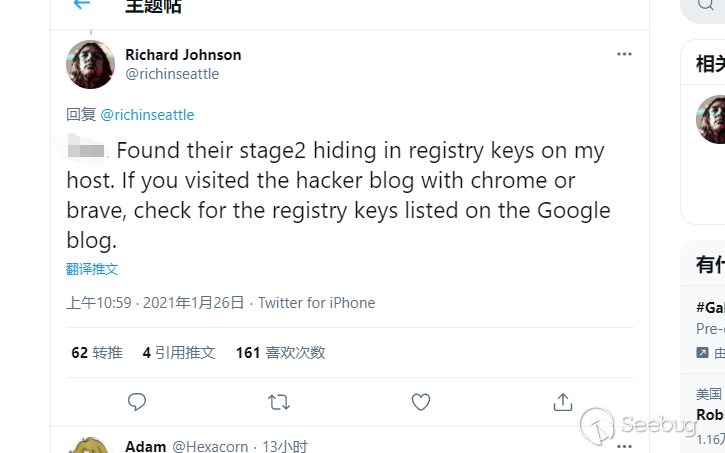 (2)攻击者Twitter会链接到他们搭建的以漏洞研究博客为内容却包含疑似漏洞利用恶意代码的水坑站点。当受害者浏览相关页面时,其电脑将被安装一个恶意服务,并启动一个内存后门程序,开始与攻击者的C2建立连接,成为一个被控的目标。