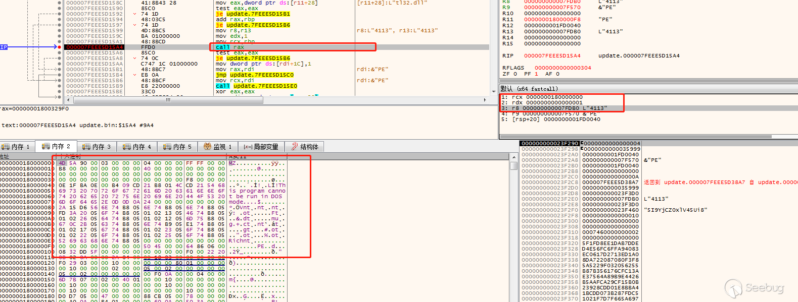 (3)内存解密释放第二阶段文件加载器update.bin,并且创建进程启动该加载器