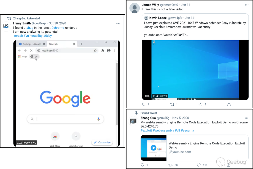 通常情况下,我们很难全面验证攻击者所发布视频中所涉及到的漏洞的真实性,也难以验证漏洞是否可用,但攻击者已经在至少一个视频中,伪造了他们成功利用所宣称可用漏洞的场景。2021年1月14日,攻击者在Twitter上分享了一个YouTube视频,宣称利用了漏洞CVE-2021-1647,并宣称该漏洞是一个最近刚被打补丁的Windows Defender漏洞。在视频中,他们演示了一个利用该漏洞生成cmd.exe的shell程序。但是,YouTube上发布的多条评论说,该视频是假的,该漏洞并非如视频中所展示,而是发布者伪造出来的。针对这些评论,攻击者利用他们所控制的另外一个Twitter账户来转发原文,并声称该视频是真的。