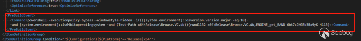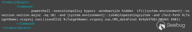 (1)在Twitter上进行一段时间的技术交流获得研究者信任后,攻击者会询问研究人员是否愿意开展合作研究,并向受害研究人员提供一个经过PGP加密的所谓“开展漏洞研究的VS源码项目”。其中在编译配置文件中调用了一段powershell脚本,加载了第一阶段的恶意DLL,进行一系列持久化配置在受害的研究者电脑建立后门,并与其C2服务建立连接,成为一个被控的目标。