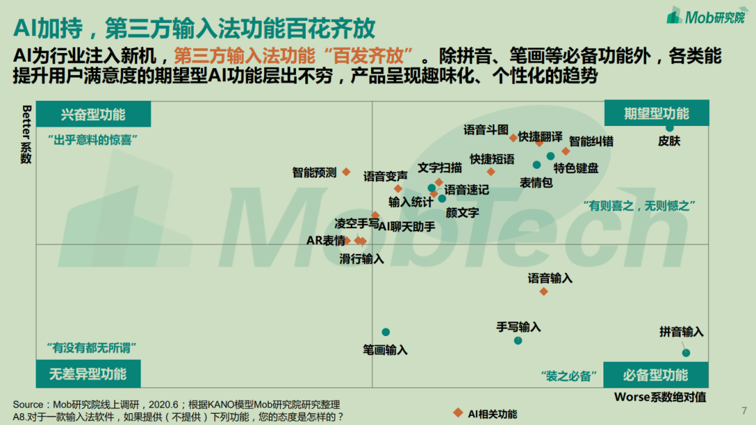 据Mob研究院的报告显示,基于AI开发的功能在用户对输入法重要的兴奋和期待型功能的占比中有着明显优势。