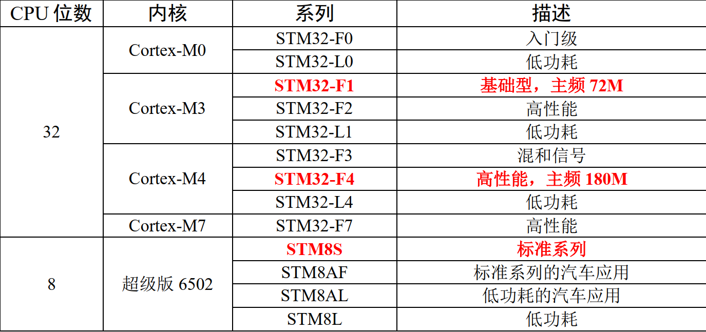 表格1 STM8和STM32分类
