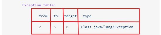 可以看到多出来一个 Exception table 的结构,[from, to) 是前闭后开的检测范围,一旦这个范围内的字节码执行出现异常,则通过 type 匹配异常类型,如果一致,进入 target 所指示行号