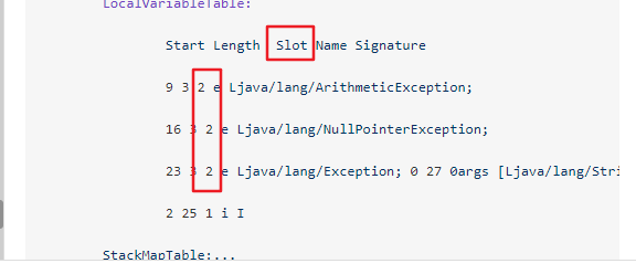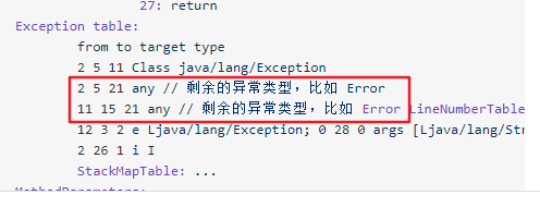11 15 21 any // 剩余的异常类型,比如 Error LineNumberTable: ... LocalVariableTable: Start Length Slot Name Signature
